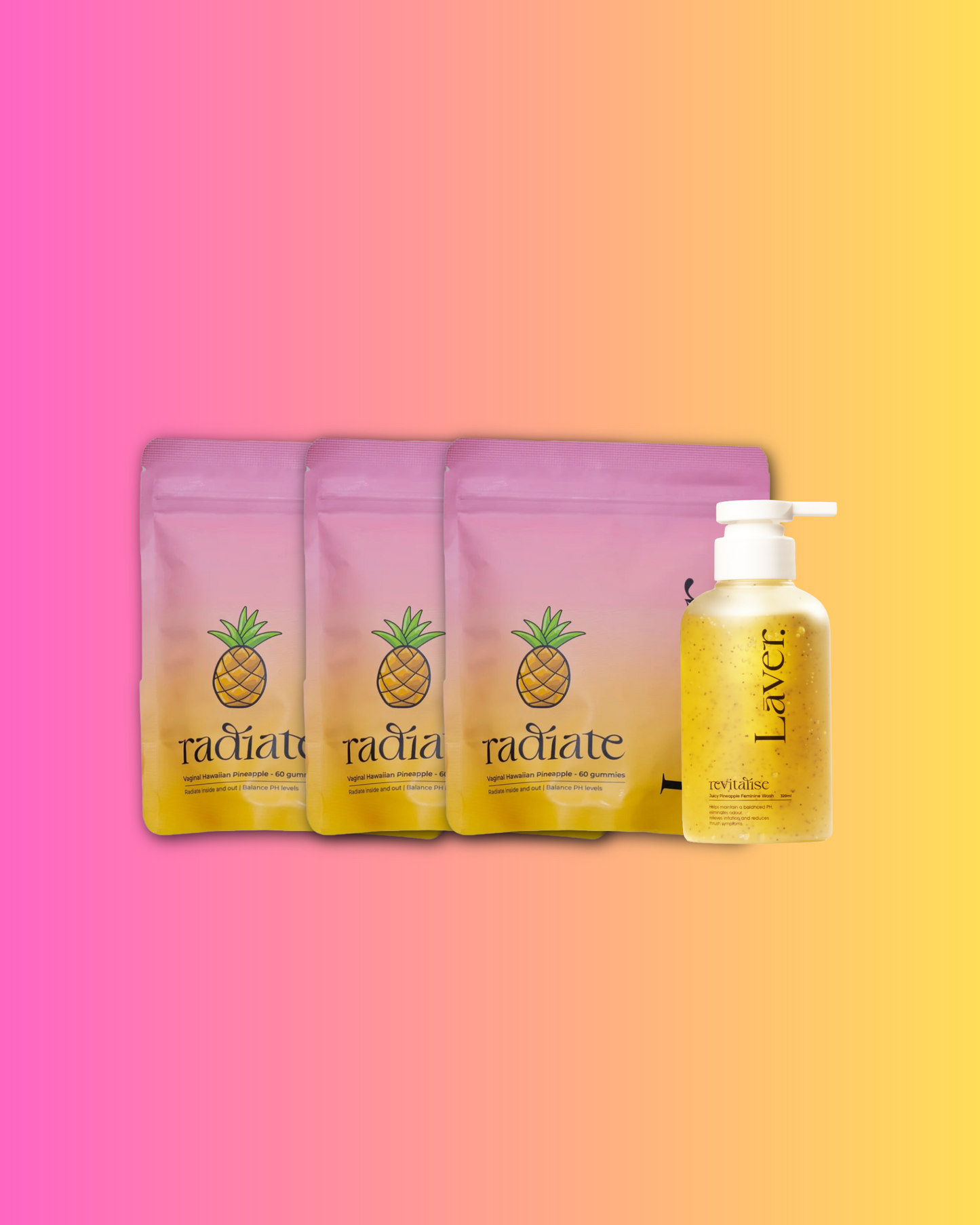 Inside you’ll find three bottles of our Juicy Hawaiian Pineapple Gummies paired with our Large Pineapple Wash. The gummies work from the inside by supporting good bacteria and helping maintain balance, while the wash keeps things clean, gentle, and naturally fresh on the outside.